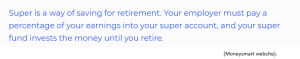 Superannuation is vehicle for savings that has been mandated for your retirement. While there are diferring points of view on superannuation, it is especially useful for borrowing in late stage of your working lives. There are tax benefits and also restrictions on withdrawal before the preservation age is achieved. There are also tax benefits for spouses as well.